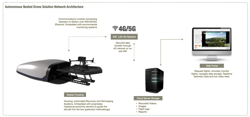 We use cutting edge technology such as our newly developed AI-driven, collaborative, swarm, nested drone system. Our autonomous drones employ a host of advanced technologies that allow them to carry out their missions without human intervention such as cloud computing, computer vision, artificial intelligence, machine learning, deep learning and thermal sensors.
